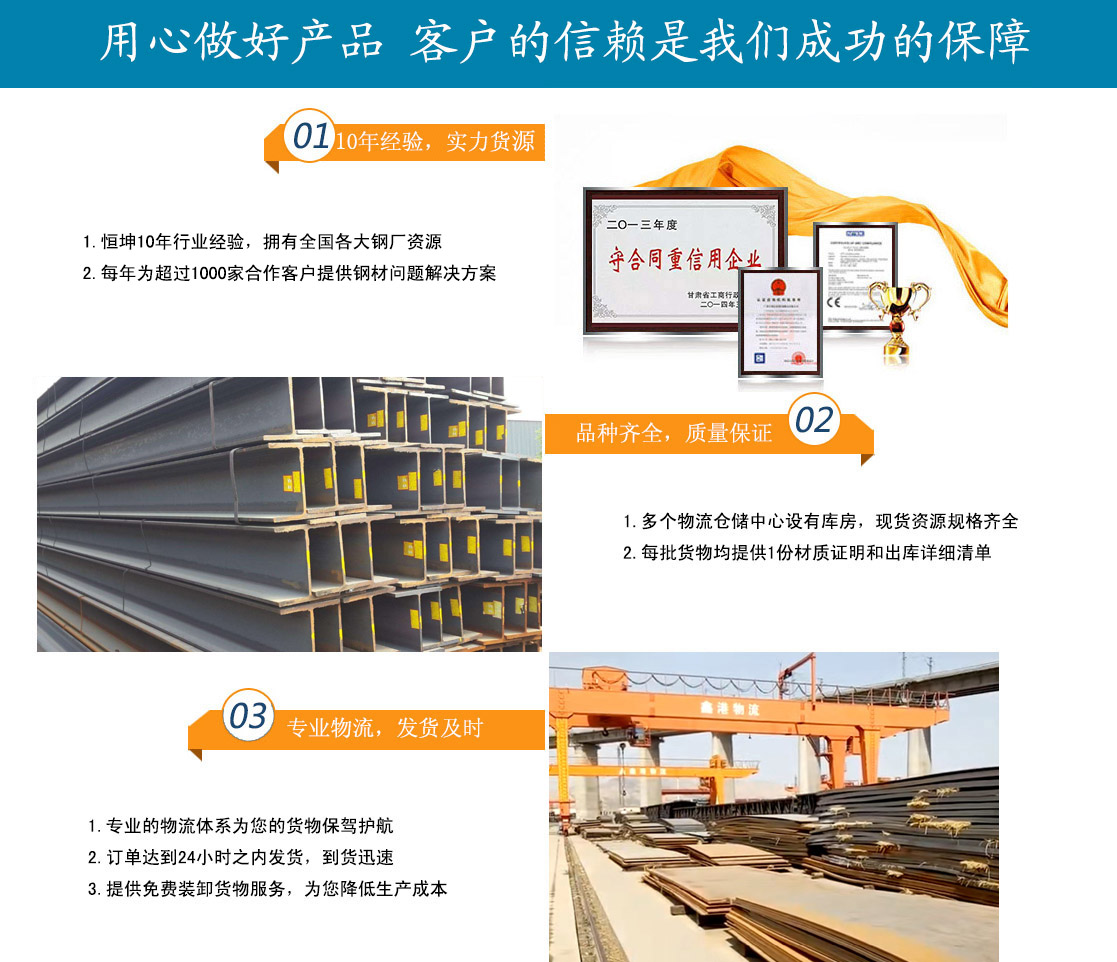 蘭州恒坤商貿(mào)有限公司立足于鋼材貿(mào)易,主要經(jīng)營:鋼板、角鋼、工字鋼、槽鋼、H型鋼、鍍鋅槽鋼、鍍鋅角鋼、鍍鋅板、鍍鋅卷、鍍鋅圓鋼、鍍鋅工字鋼多種型號鋼材產(chǎn)品。多年來,我公司始終堅持質(zhì)量第一,信譽至上的經(jīng)營方針,與酒鋼、包鋼、八鋼、唐鋼、鞍鋼、萊鋼、兗礦、日照鋼鐵、濟鋼,成都、天津等多家企業(yè)達(dá)成大批量物資供應(yīng)協(xié)議,并且與省內(nèi)外多家客戶建立了合作關(guān)系。
